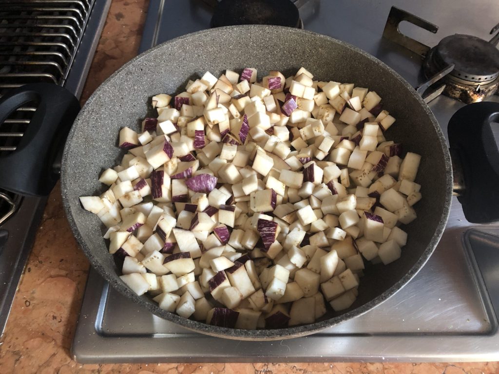 Calentar unas cucharadas de aceite en una cazuela antes de añadir los dados de berenjena. Saltearlos a fuego vivo durante cinco minutos, removiendo a menudo. Luego sazonar con un par de generosas pizcas de sal y dejarlos aromatizar durante otros dos minutos. Finalmente apagar el fuego y reservar. Lamentablemente olvidé hacer la foto.