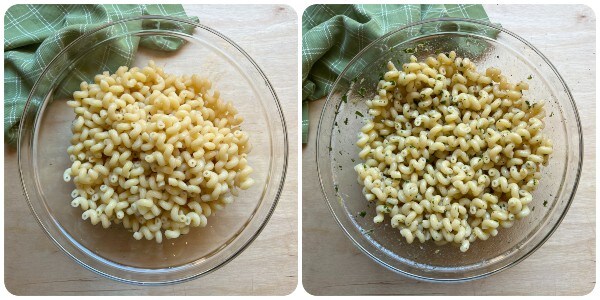 Verter aceite en un cuenco grande que pueda contener toda la pasta. Añadir una generosa pizca de sal, una abundante molienda de pimienta negra, ralladura y zumo de limón, perejil fresco y emulsionar todo con un tenedor. Si se desea, se puede añadir también un diente de ajo picado y sin el germen central o exprimido. Yo lo corté en cuatro trozos, dejé reposar la emulsión durante una hora y los eliminé antes de condimentar la pasta.