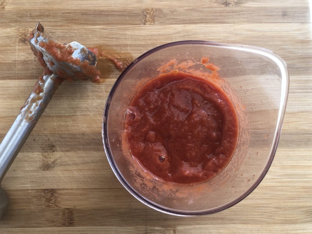 Transfiera los tomates pelados al vaso de una batidora de inmersión y tritúrelos.