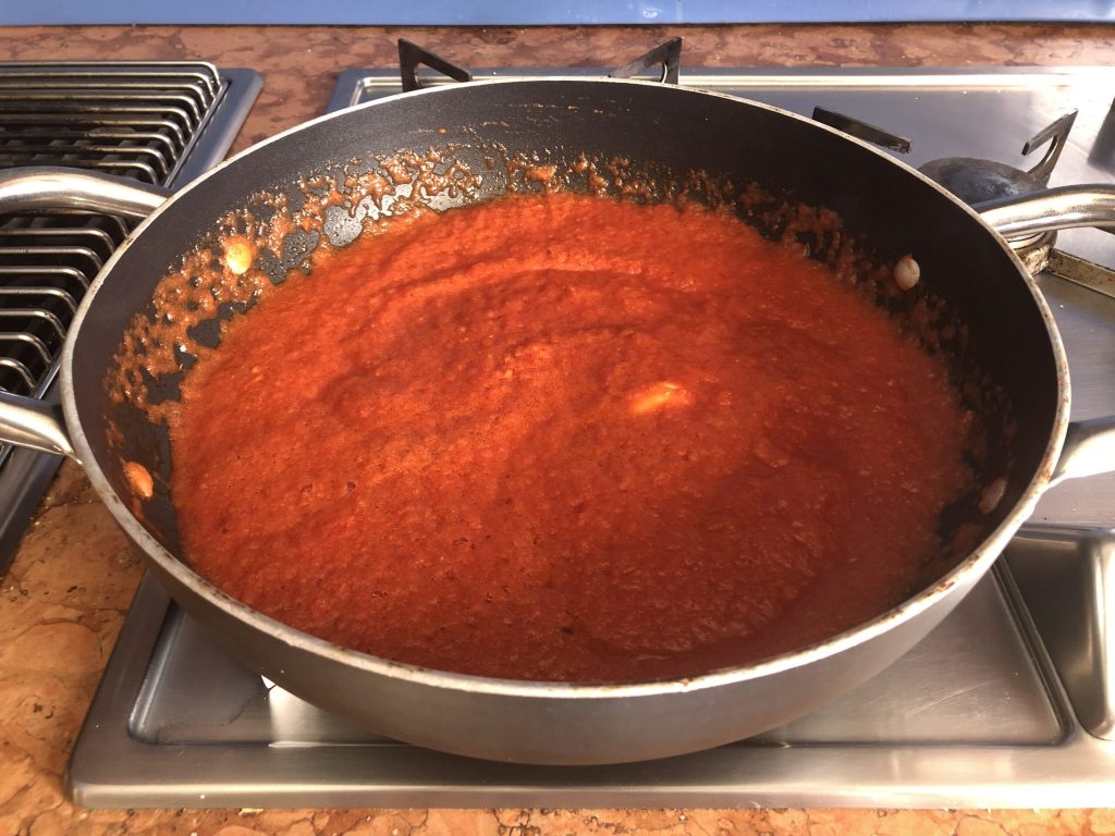 Déjelo chisporrotear por un momento, luego agregue los tomates triturados y una pizca de bicarbonato para eliminar la acidez.