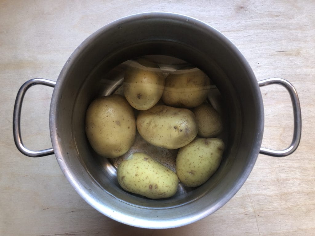 Lavar muy bien las patatas y hervirlas con la piel, empezando con agua fría salada. Estarán listas cuando puedas clavar fácilmente los dientes de un tenedor. Si tienes patatas de diferentes tamaños, contrólalas para poder sacarlas en el momento justo.