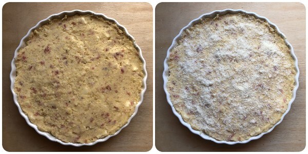Transferir la mezcla obtenida en la fuente para hornear preparada anteriormente y espolvorear toda la superficie con el resto del queso rallado.