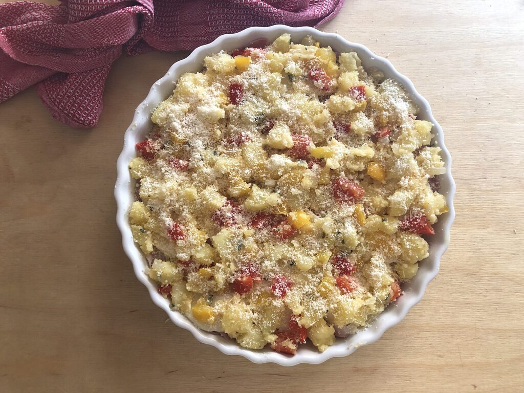 Completar con el resto del compuesto de verduras y espolvorear la superficie con el queso rallado restante (20 g).