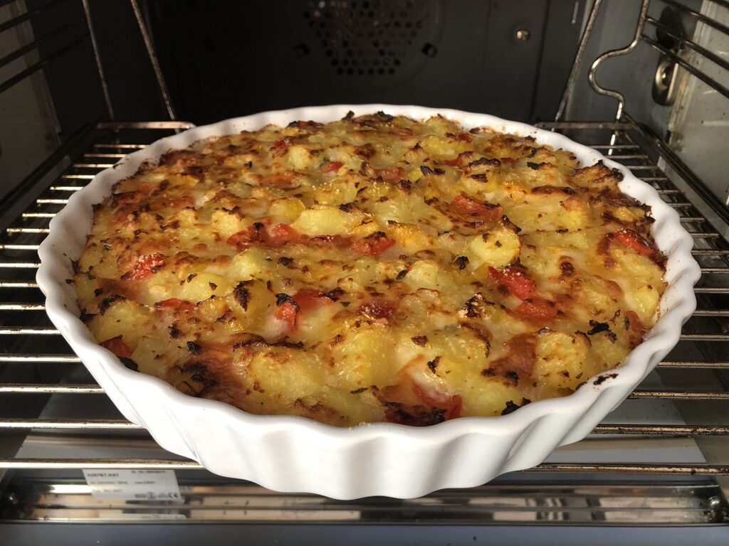 Cocinar el pastel de patatas y pimientos con queso fundido en horno estático precalentado a 190° durante 25 minutos más algunos minutos en función grill. Una vez cocido, debe estar bien dorado.