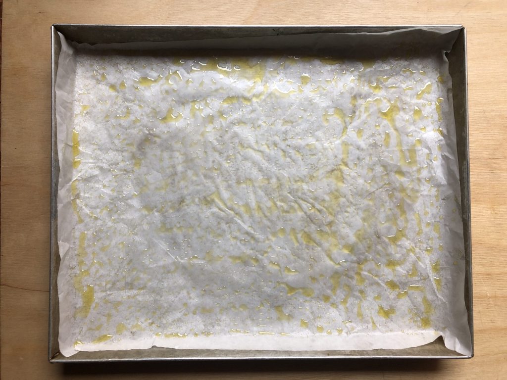 Cubrir una bandeja con papel de horno y pincelarla con un poco de aceite.