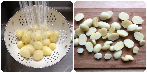 Yo he elegido patatas mignon precocidas al vapor porque esta quiere ser una receta rápida, hecha al estilo exprés como me gusta decir: se encuentran cómodamente envasadas al vacío en el supermercado y ahorran bastante tiempo. Como alternativa, también van bien las patatas nuevas, que son pequeñas y redondas de la misma manera, o patatas comunes, para cortar en rodajas: en ambos casos deberán ser escaldadas primero. Obviamente deberán resultar apenas tiernas y no completamente cocidas porque terminarán su cocción en el horno. Si usáis patatas grandes, os recomiendo pelarlas y escaldarlas ya cortadas justo el tiempo para ablandarlas. Diría que las rodajas de patatas comunes deben ser escaldadas por 6-8 minutos, mientras que las patatas nuevas enteras requieren 10-12 minutos. Pero vigiladlas.