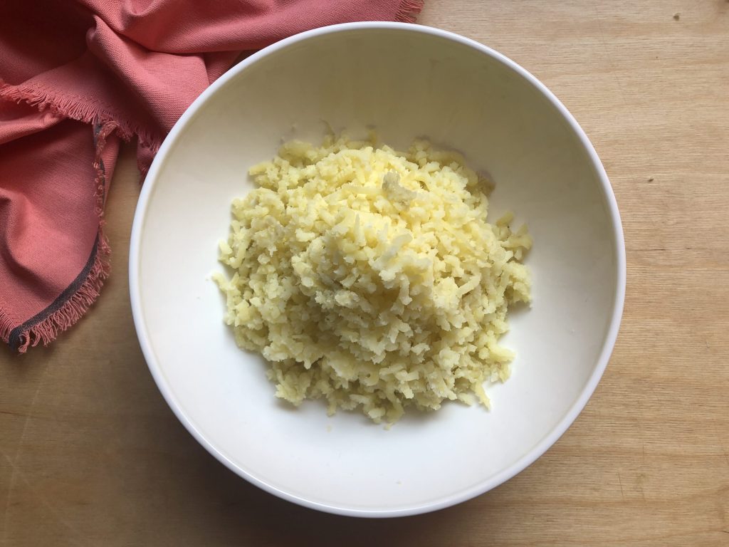 • Pasarlas inmediatamente al prensapatatas, recogiendo el puré en un bol grande. Te recuerdo que no es necesario eliminar la piel que quedará dentro del utensilio.