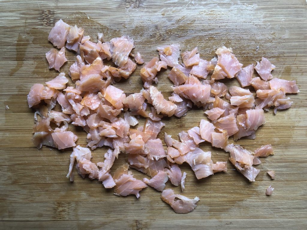 • Dejarla chisporrotear por un momento, luego agregar los trozos de salmón.