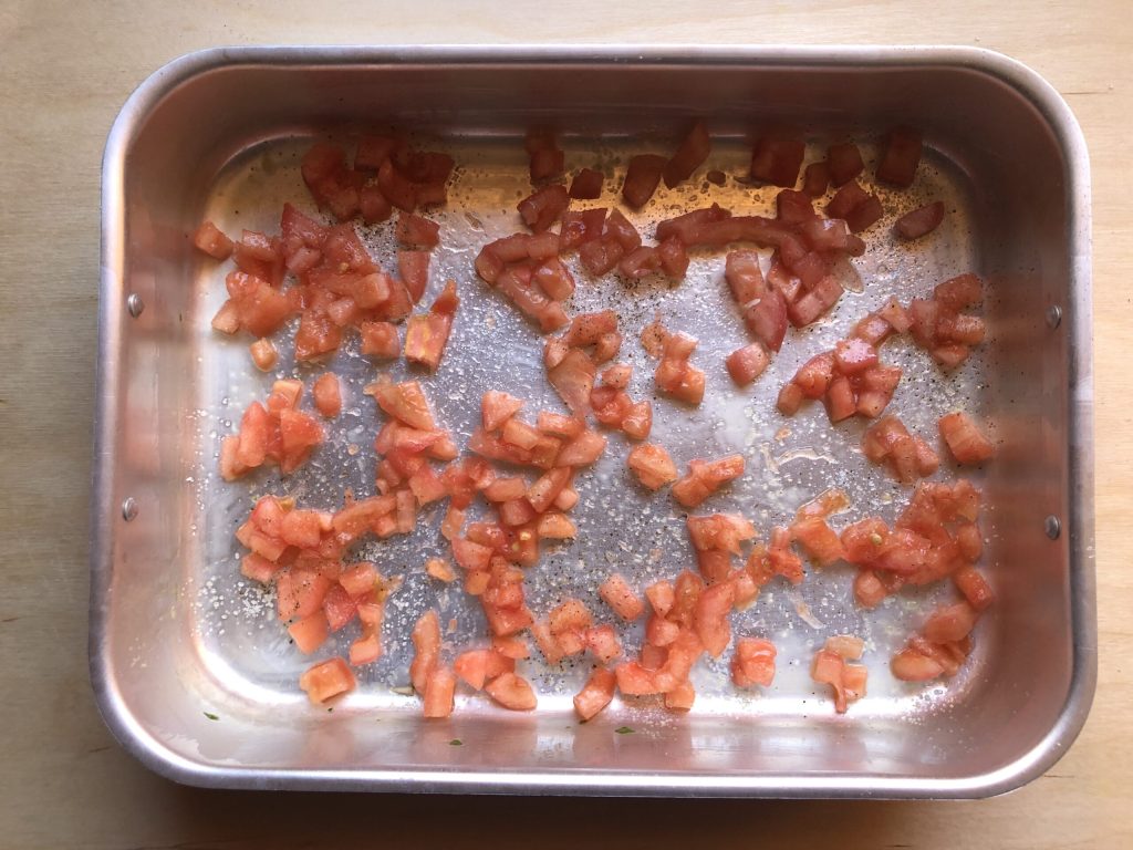 Engrasar con aceite una bandeja de horno y repartir la mitad de los trocitos de tomate sazonándolos con sal y pimienta.