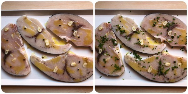 Enjuagar las rodajas de pez espada, secarlas con papel de cocina y colocarlas en una bandeja o dentro de una bandeja de horno. Rociarlas con un hilo de aceite y el jugo de medio limón; luego añadir las rodajas de un diente de ajo y algunos granos de pimienta negra.