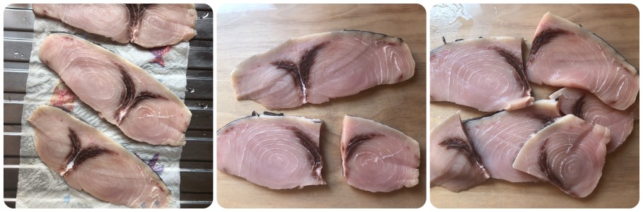 Enjuagar bien las rodajas de pez espada y secarlas dando toques con papel de cocina. Como las mías eran bastante grandes, las corté por la mitad.