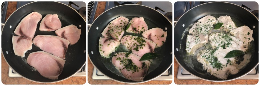 Luego agregar las dos hojas de laurel, algunos granos de pimienta negra, perejil picado, una generosa pizca de sal y rociar con el vino blanco.
