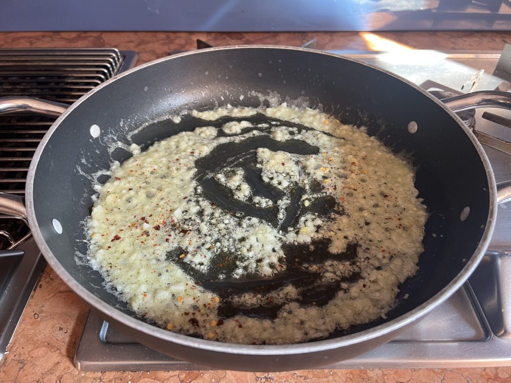 Pelar los dientes de aglione y picarlos finamente (yo usé un cuchillo de media luna).