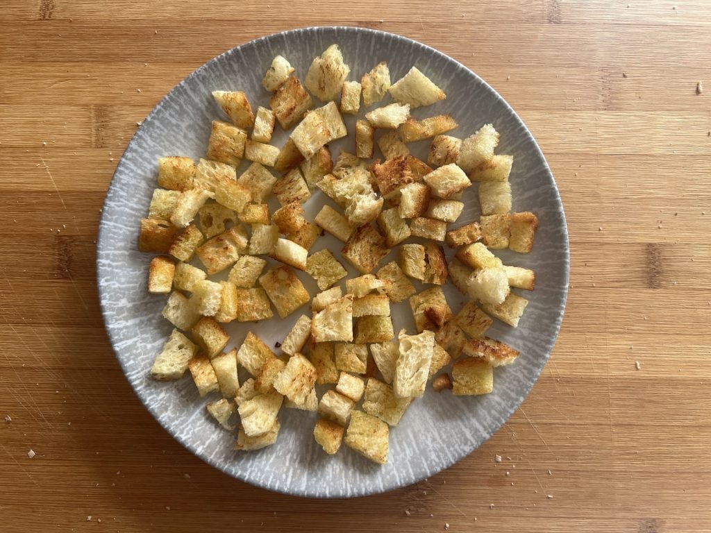 Finalmente, añadir los dados de pan tostado y una generosa pizca de orégano. Ajustar de sal si es necesario y retirar el diente de ajo.