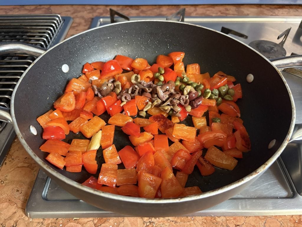 Cuando los pimientos estén cocidos, añadir las alcaparras y las aceitunas y continuar la cocción durante un minuto a fuego alto, removiendo a menudo.