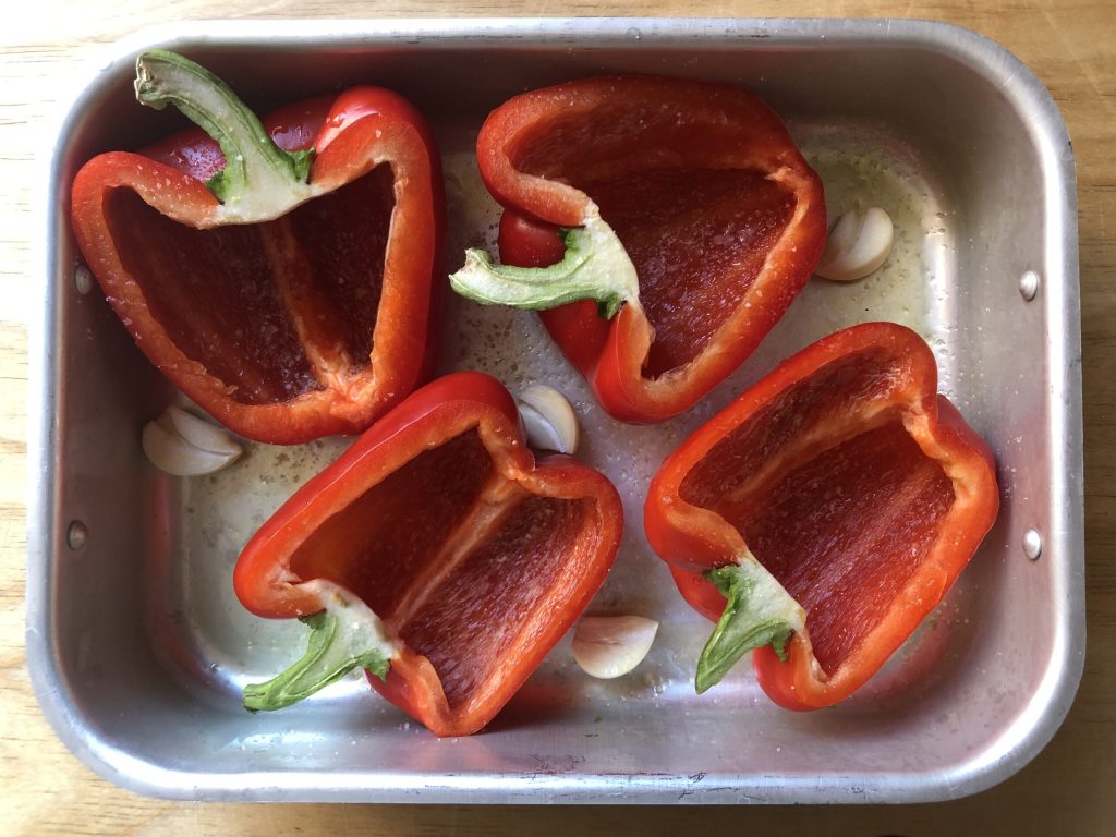 Colocar las mitades de pimiento en una bandeja de horno engrasada con aceite y salarlas ligeramente.