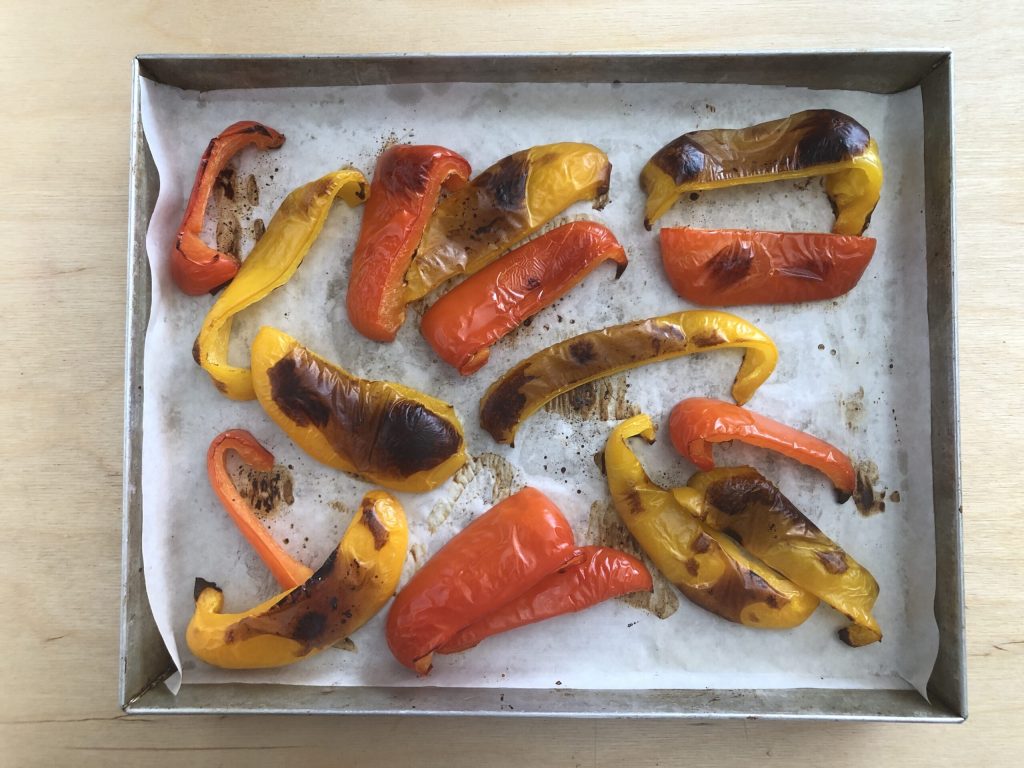 Sacar los pimientos del horno, quitarles la piel quemada (esto los hará aún más digestibles) y colocarlos en el plato de servir.