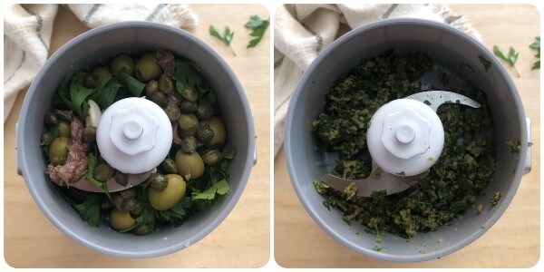 Lavar y secar las hojas de perejil y picarlas junto con el ajo, las alcaparras, los filetes de anchoa y las aceitunas verdes.
