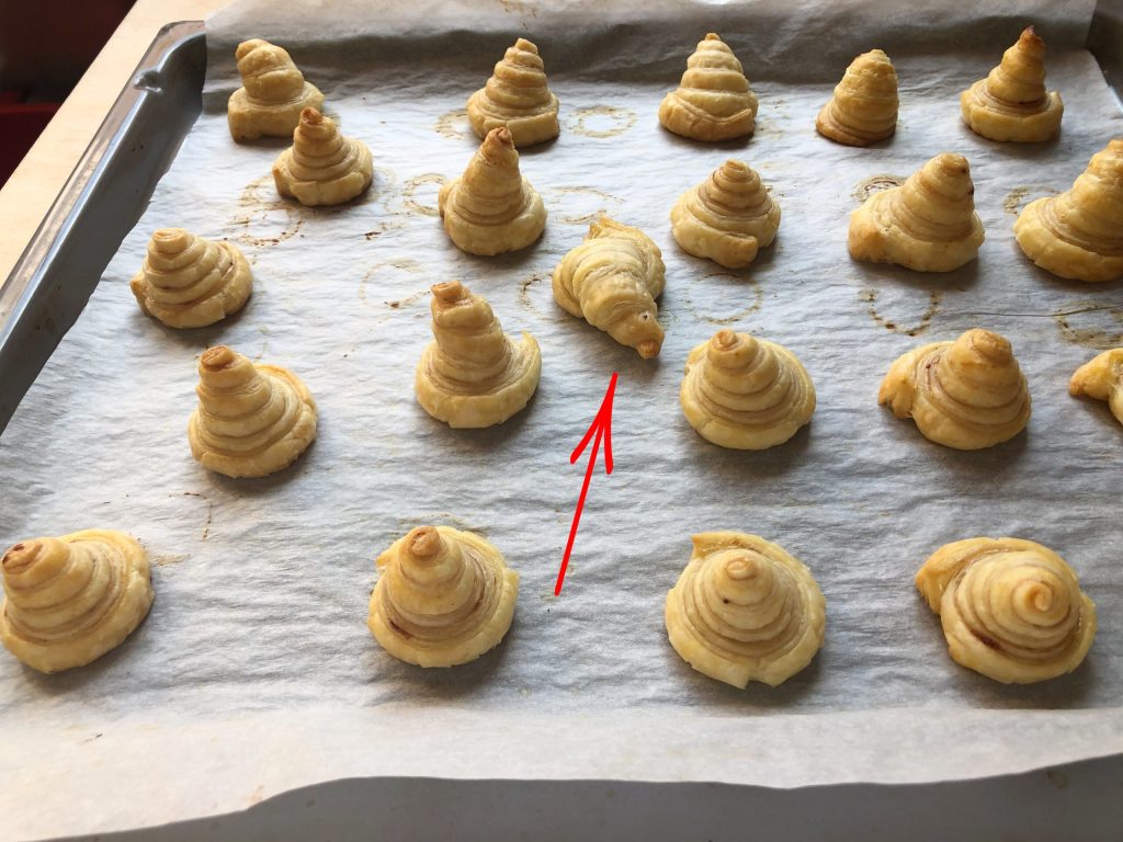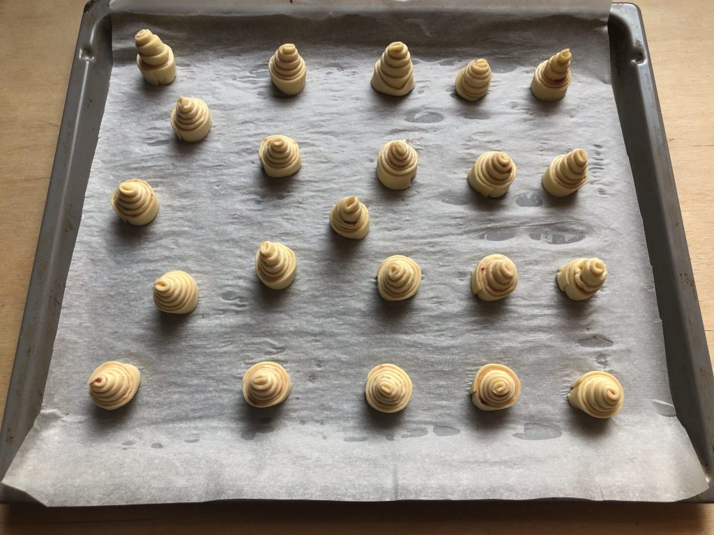 En este punto enrollar cada tira de modo que se obtenga una pequeña pirámide. Una vez alcanzado el final, sellar el extremo con los dedos ligeramente humedecidos. No hagáis pirámides demasiado altas porque de lo contrario se aplastarán durante la cocción. Hice una prueba y podéis ver el resultado en la última foto de este artículo.