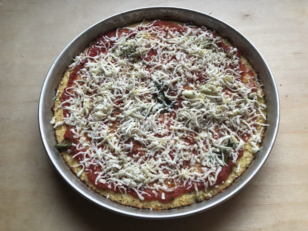 Yo he adornado esta pizza de coliflor con alcaparras y anchoas, pero pueden poner sobre la base de tomate y mozzarella los ingredientes que prefieran.
