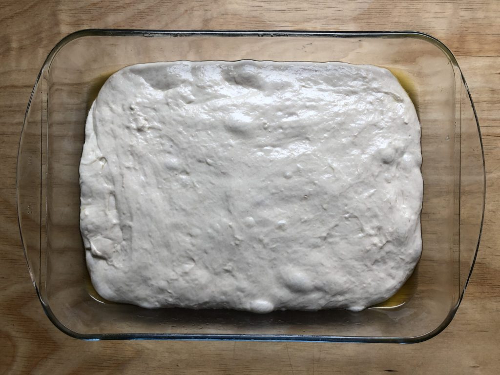 Yo preparé la masa de esta pizza focaccia con la batidora planetaria pero podéis hacerla a mano, trabajando los ingredientes directamente dentro de la bandeja donde la dejaréis fermentar.