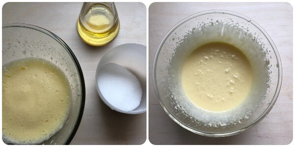 Con las batidoras en movimiento, añadir gradualmente el azúcar y luego el aceite en hilo (naturalmente me fue imposible tomar la foto de estos dos pasos estando sola).