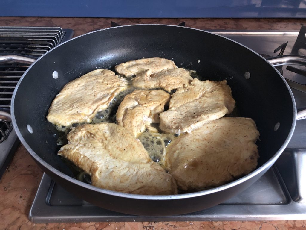 Transcurrido el tiempo de marinada, calentad muy bien una sartén amplia antes de colocar las lonchas de pechuga de pollo. No añadáis aceite porque el de la marinada es más que suficiente. No solapéis las lonchas. Si la sartén es demasiado pequeña, cocinad en dos tandas.