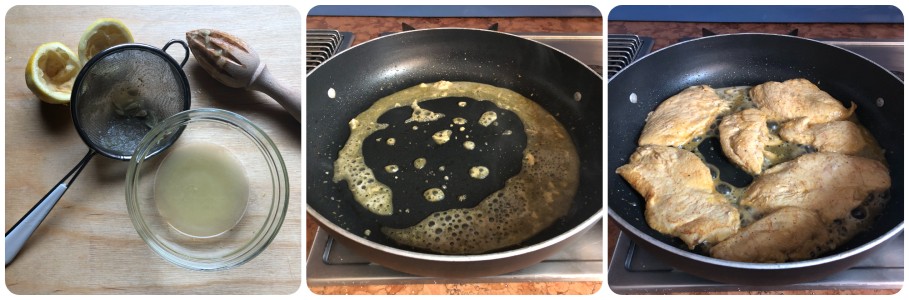 En la misma sartén, bajad el fuego y añadid el zumo de un limón previamente colado a través de un pequeño colador. Dejad que chisporrotee durante 30/40 segundos raspando el fondo con una cuchara de madera, luego volved a incorporar las lonchas de carne y dejadlas impregnarse 10/20 segundos por lado.