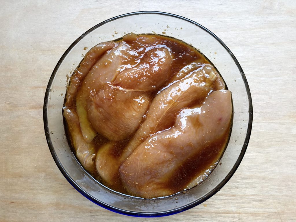 • Luego, coloca en el recipiente las lonchas de pechuga de pollo y masajéalas con las manos hasta que estén perfectamente cubiertas por la marinada. Cubre y deja reposar al menos una horita para que la carne absorba bien todos los aromas.