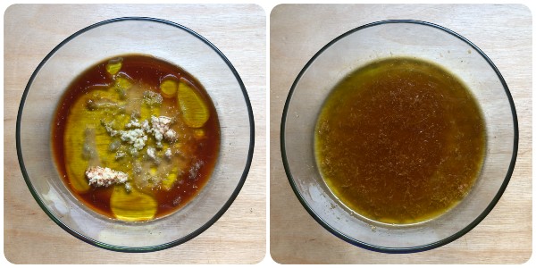 • Pon en una fuente o en un recipiente la miel, el zumo de limón, la salsa de soja, el aceite, el jengibre rallado, un pellizco de ajo en polvo y mezcla con cuidado hasta integrar perfectamente todos estos ingredientes.