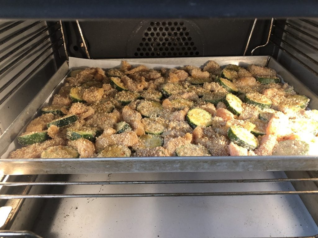 Distribuir pollo y calabacines dentro de una bandeja forrada con papel de horno, tratando de alternarlos entre sí. Finalmente, esparcir el empanado sobrante y rociar con un hilo de aceite.