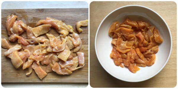 Quitar las partes grasas de las rodajas de pechuga de pollo, cortarlas en trocitos y colocarlas en un cuenco.