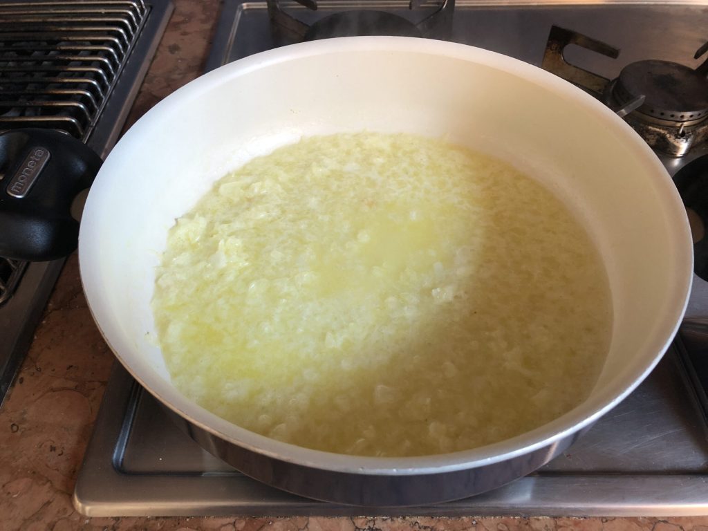 En una cazuela grande, pochar suavemente la cebolla junto con la mantequilla, una cucharada de aceite y un par de cucharadas de caldo caliente.