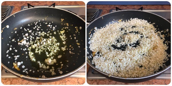 En la misma cazuela, preparar otra sofrito con la chalota restante añadiendo un poco de aceite. Añadir el arroz y dejar tostar por un par de minutos.