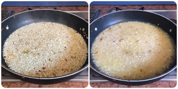 Luego desglasar con un chorrito de vino blanco y cuando el vino se haya evaporado, comenzar a añadir el caldo caliente poco a poco a medida que se absorba.