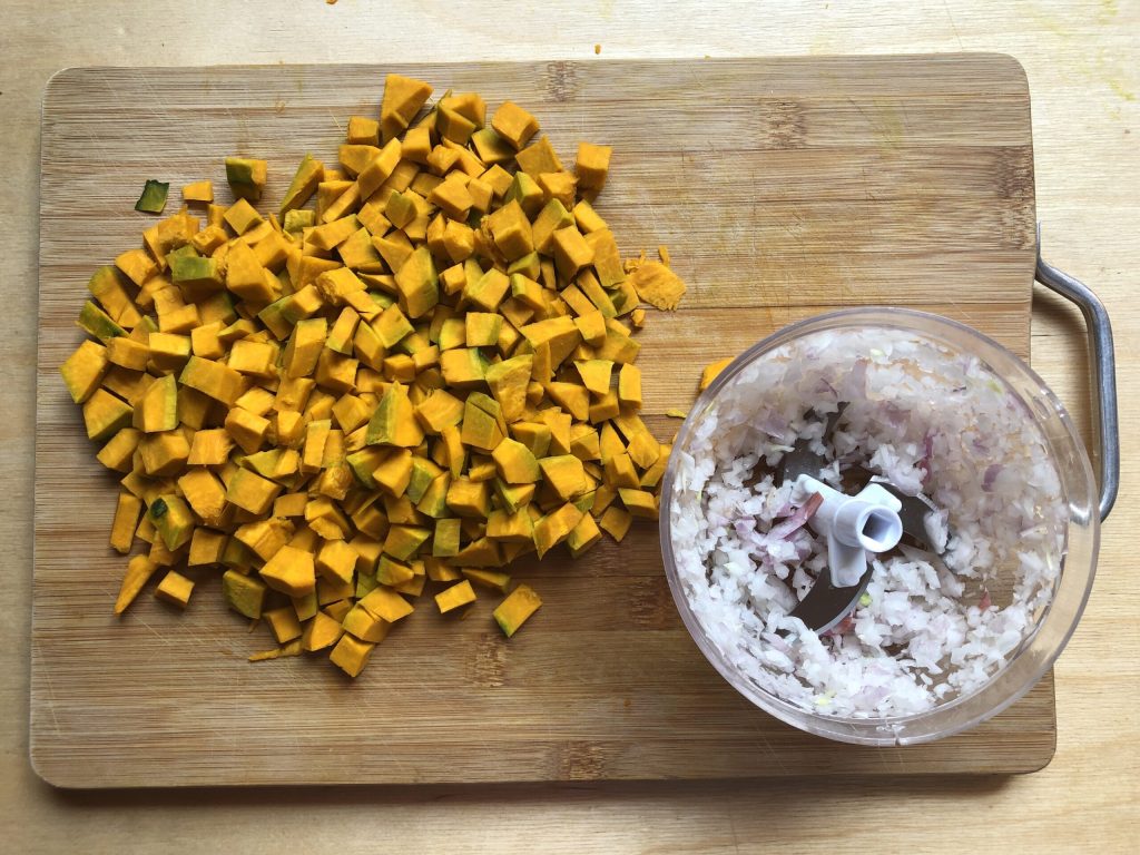 • Limpiar la calabaza, eliminando la piel, las semillas y todos los filamentos internos. Lavarla, secarla dándole golpecitos con papel de cocina y cortarla en dados.