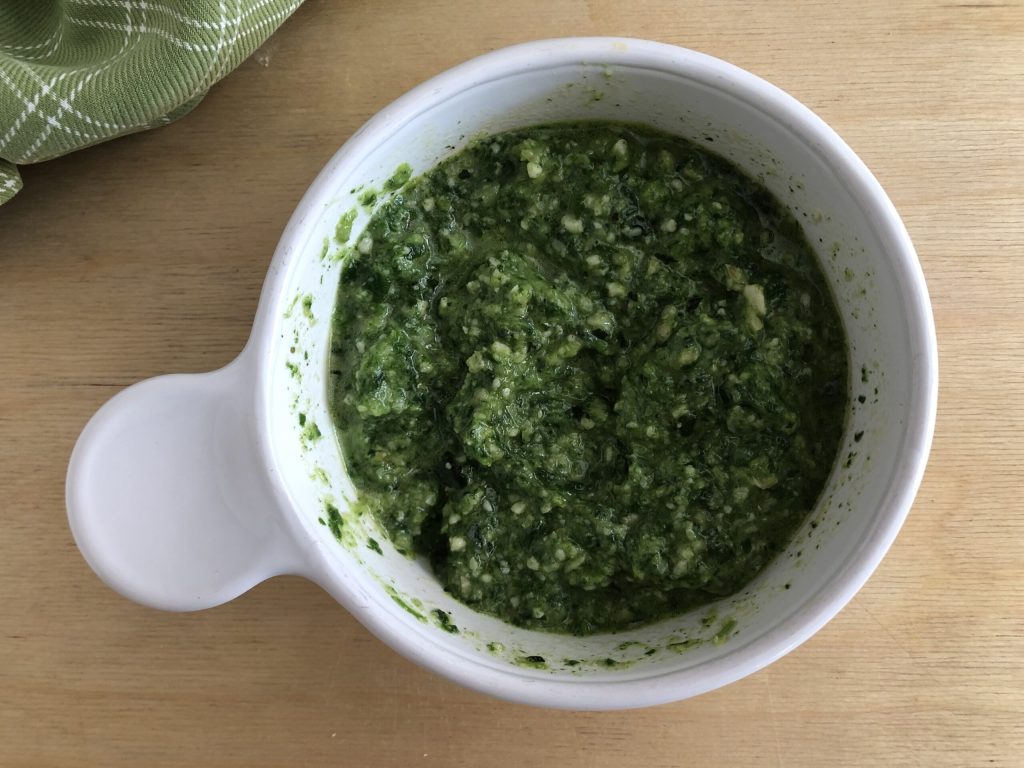 Cuando la cocción esté prácticamente terminada, añadir el pesto preparado y mezclar con cuidado para amalgamar perfectamente todos los ingredientes.