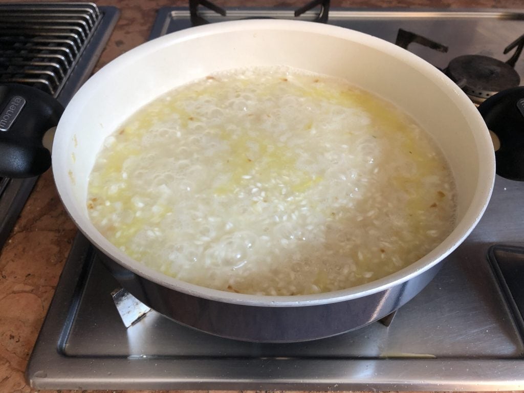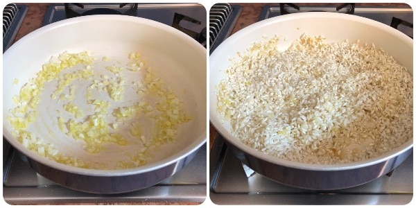 En una sartén grande, calentar unas cucharadas de aceite y dorar la cebolleta finamente picada. Añadir el arroz y tostarlo durante un par de minutos, luego mojar con el vino blanco y dejar que se evapore.