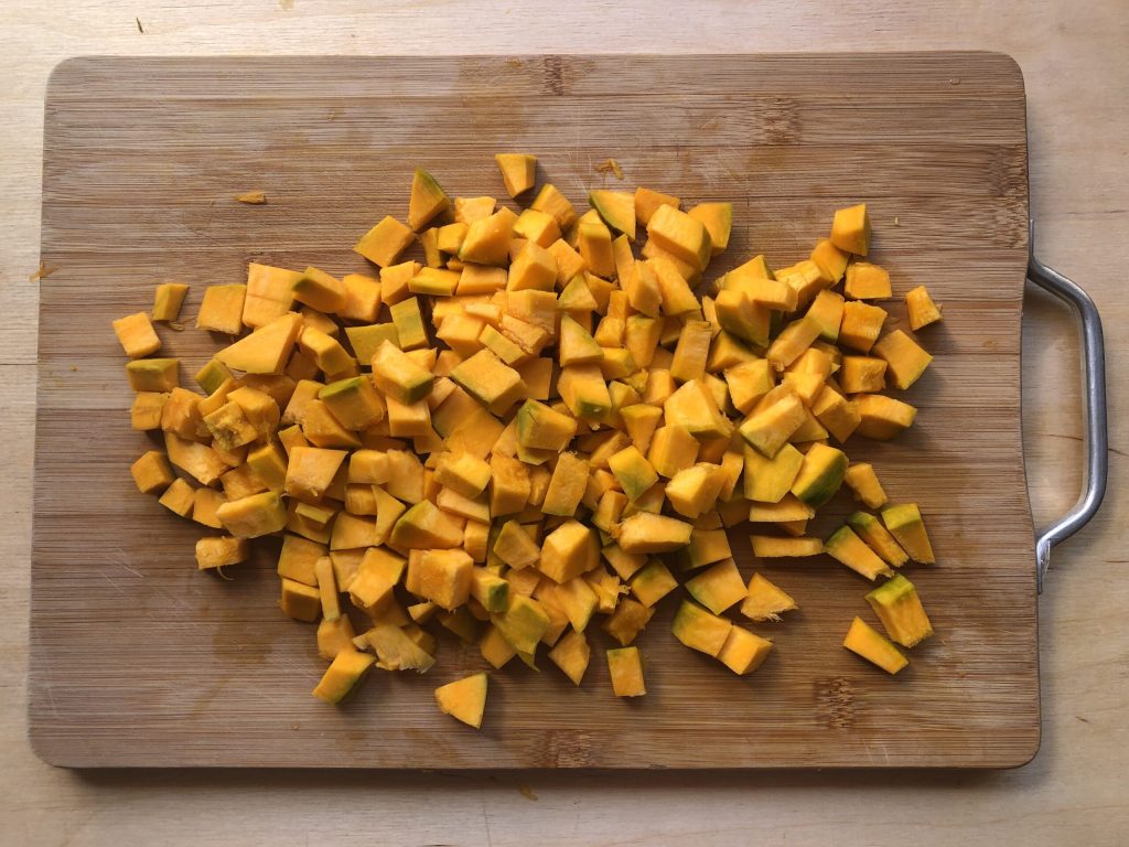 Limpia la calabaza, eliminando la cáscara, las semillas y todos los filamentos internos. Láviala, sécala con papel de cocina y córtala en cubitos pequeños.