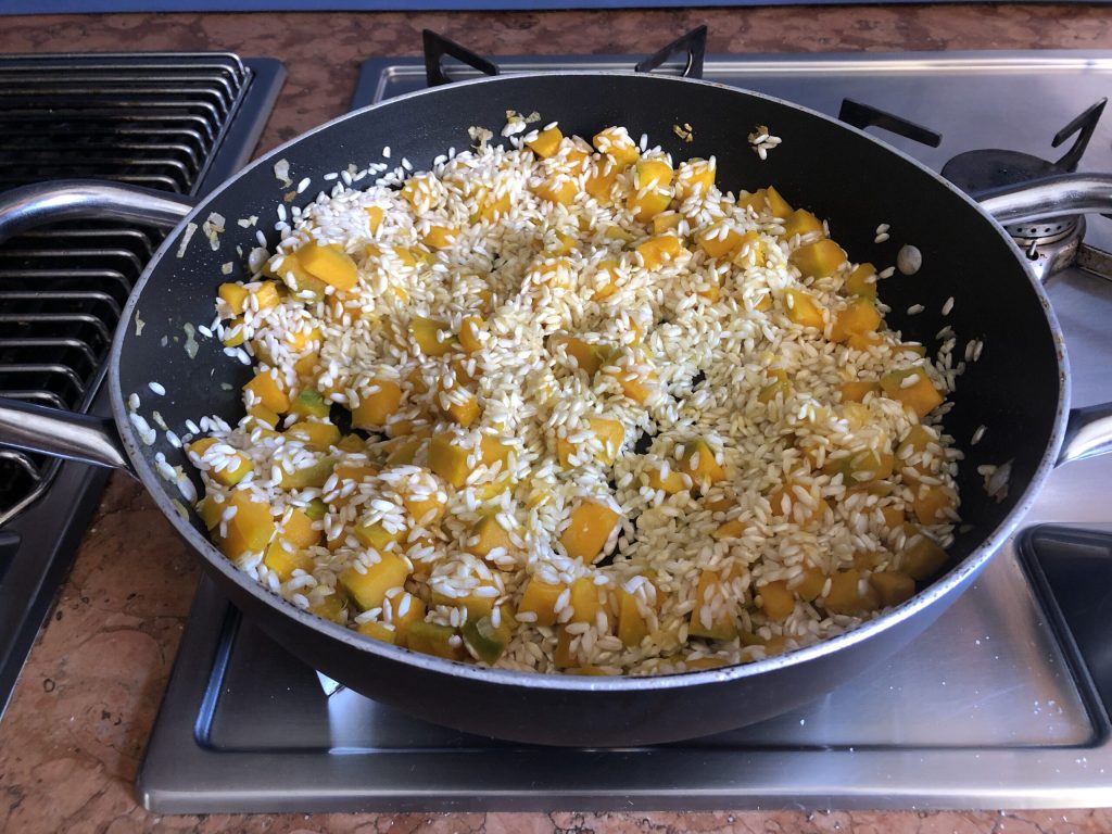 Cuando los cubitos de calabaza estén blandos, añade el arroz y déjalo tostar por un par de minutos removiendo con frecuencia hasta que los granos se vuelvan translúcidos.
