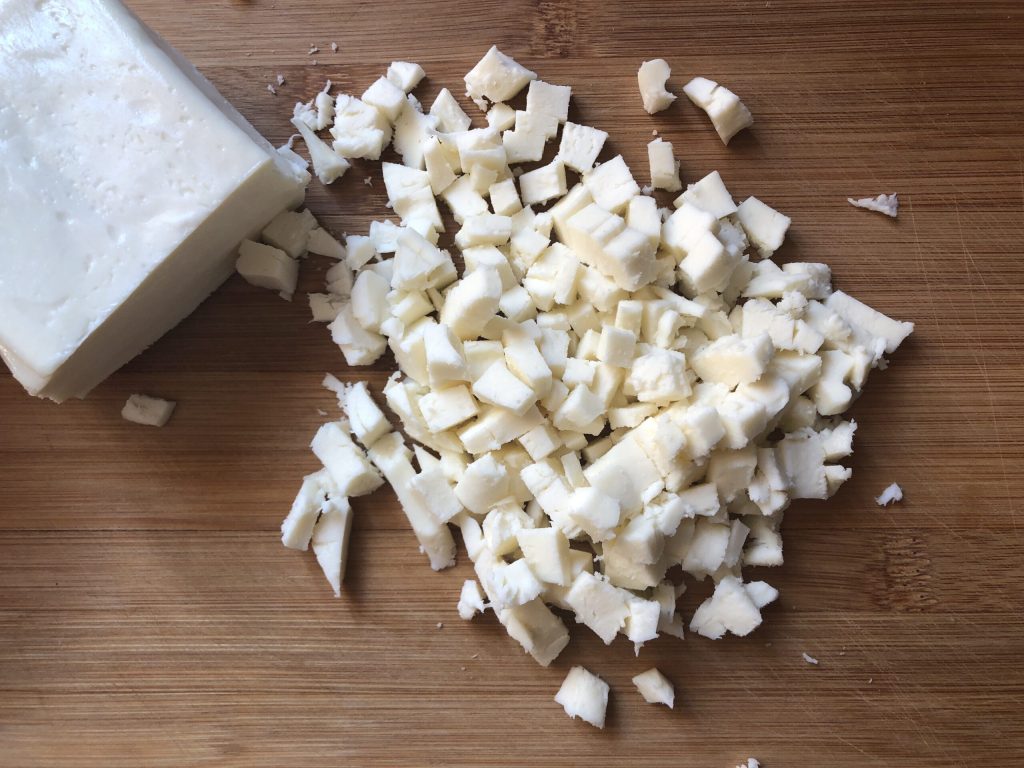 Cortar la mozzarella en trocitos: os recomiendo utilizar una mozzarella para pizza ya que, siendo más compacta, libera menos agua durante la cocción.