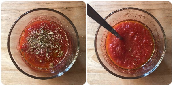 Poner la pulpa de tomate en un cuenco pequeño y condimentarla con una generosa pizca de sal, un chorrito de aceite y abundante orégano.