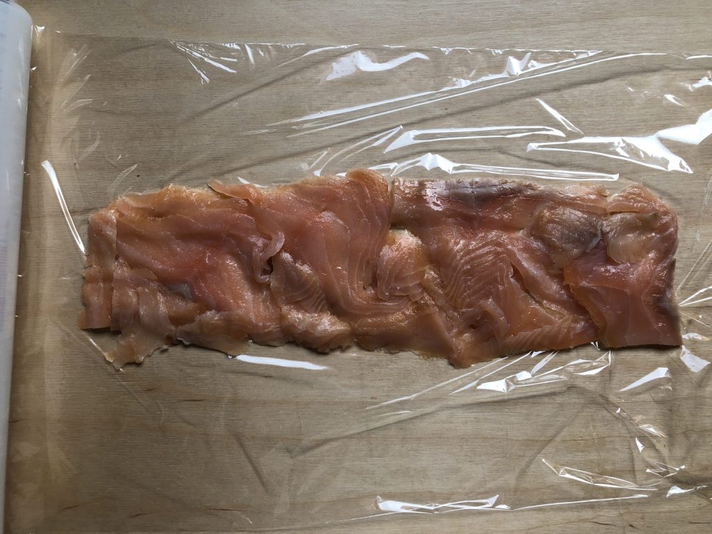 Extender una hoja de papel film para alimentos y colocar las lonchas de salmón una al lado de la otra para formar un rectángulo: el mío mide 35 × 12 cm.
