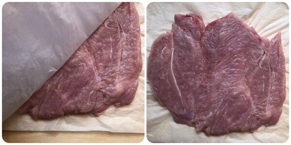 Colocar la pechuga de pavo cortada en forma de libro entre dos hojas de papel de horno y golpearla con un mazo de cocina para hacerla lo más uniforme posible. Intentad obtener un rectángulo más o menos regular.