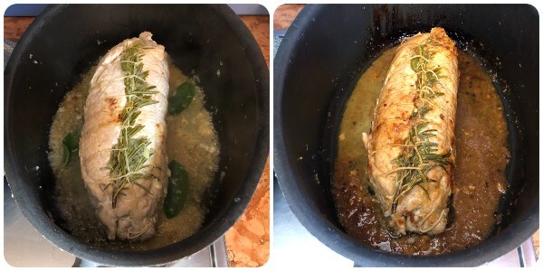 Dejarlo evaporar ligeramente, luego añadir las hojas de salvia, poner la tapa y continuar la cocción durante aproximadamente una hora y veinte minutos girando el asado de vez en cuando. Si el fondo de cocción se seca demasiado, verted en la cacerola un poco de caldo caliente.
