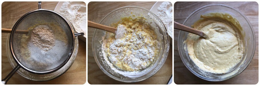 En este punto, incorporar gradualmente la harina tamizándola junto con la levadura a través de un colador de malla fina.