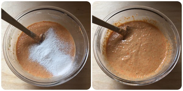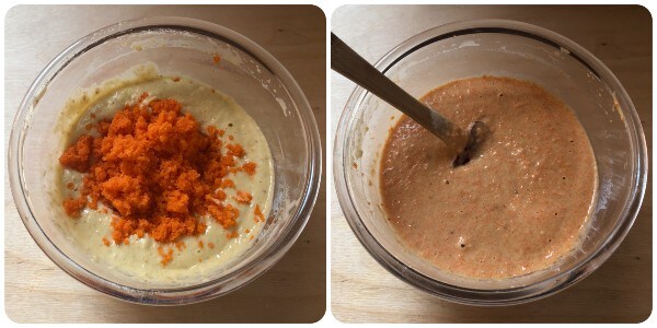 Una vez incorporados bien todos estos ingredientes, verter en la masa también las zanahorias trituradas y mezclar cuidadosamente con una espátula.