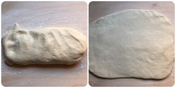Pasado el tiempo de este primer levado, transferir la masa a la mesa de trabajo ligeramente enharinada y extenderla con el rodillo formando un rectángulo.
