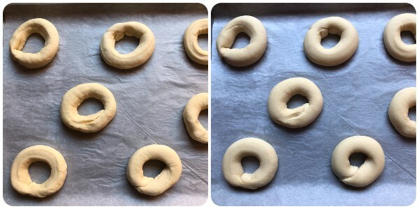Disponer poco a poco las rosquillas en las bandejas de horno cubiertas con papel de horno (se necesitarán dos y serán necesarias dos hornadas).