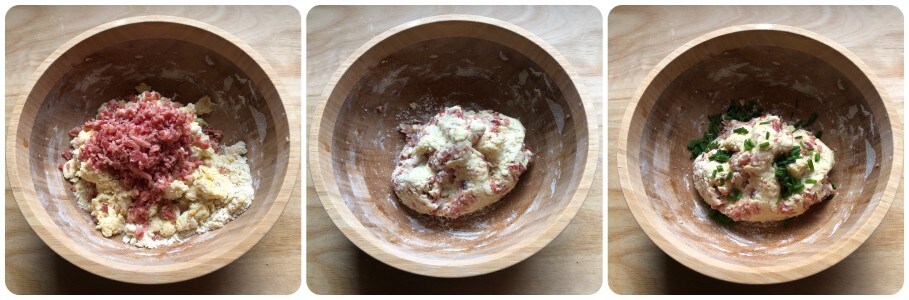 Luego añadir también el speck picado finamente (yo lo puse en un mezclador) y el cebollino cortado con tijeras.